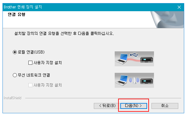 프린터 연결 유형을 선택하세요. 로컬 또는 무선연결이 가능합니다.