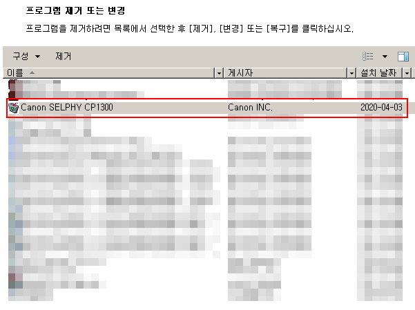 프로그램의 삭제는 제어판 - 프로그램 추가/제거에서 Canon SELPHY CP1300 를 선택하고 지우면 됩니다.