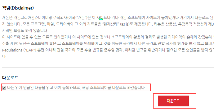 위 링크로 이동하여 아래쪽으로 스크롤한 후 '나는 위에 언급된 내용을 읽고 이에 동의하므로, 해당 소프트웨어를 다운로드 하겠습니다.' 이 부분에 체크를 하고 다운로드 버튼을 클릭합니다.