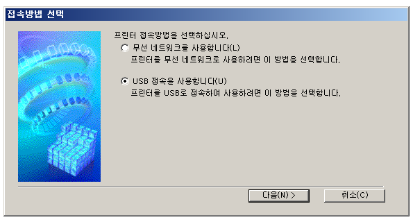 프린터에 접속할 방법을 선택합니다. 무선 네트워크와 USB 접속방식이 있습니다.