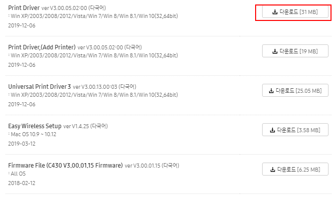 위 링크로 이동하여 다운로드 아래에 있는 Print Driver 옆에 다운로드 버튼을 클릭합니다.