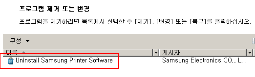 프로그램을 설치한 후의 제어판 - 프로그램에 추가된 내용입니다. 이 드라이버를 삭제하려면 Uninstall Samsung Printer Software 를 더블클릭해서 삭제하면 됩니다.