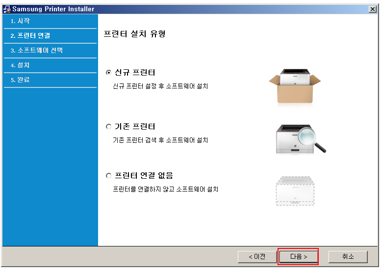 프린터 설치 유형을 선택하세요. 신규, 기존 프린터, 드라이버만 설치가 있습니다.