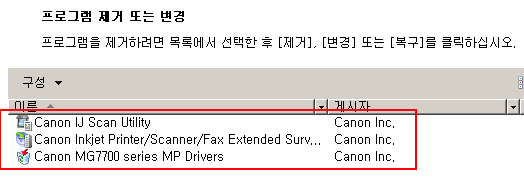 프린터 드라이버의 삭제는 제어판 - 프로그램 제거/변경에서 더블클릭하면 삭제할 수 있습니다.