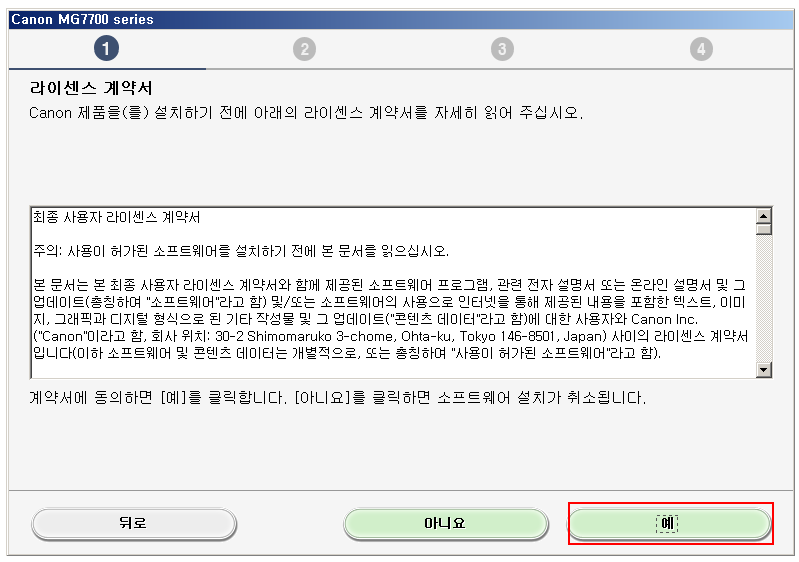 라이센스 계약서에 동의에 예를 클릭합니다.