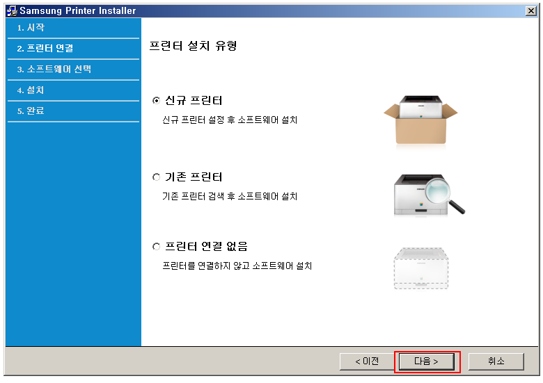 프린터 설치 유형을 선택하세요. 신규, 기존, 수동 설치가 있습니다.