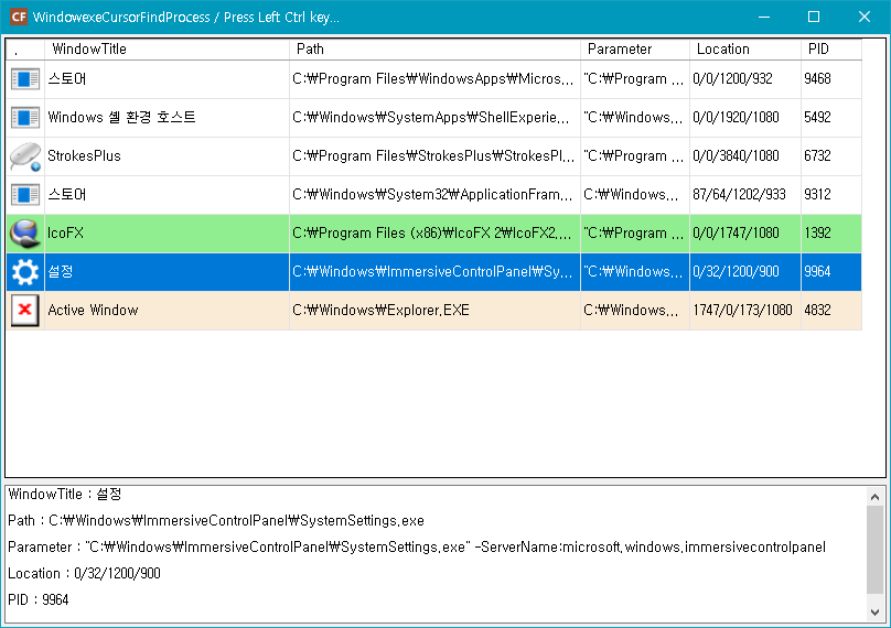 두번째 방법. 마우스 포인터에 위치한 모든 윈도우를 찾는 WindowexeCursorFindProcess 자작프로그램입니다.
