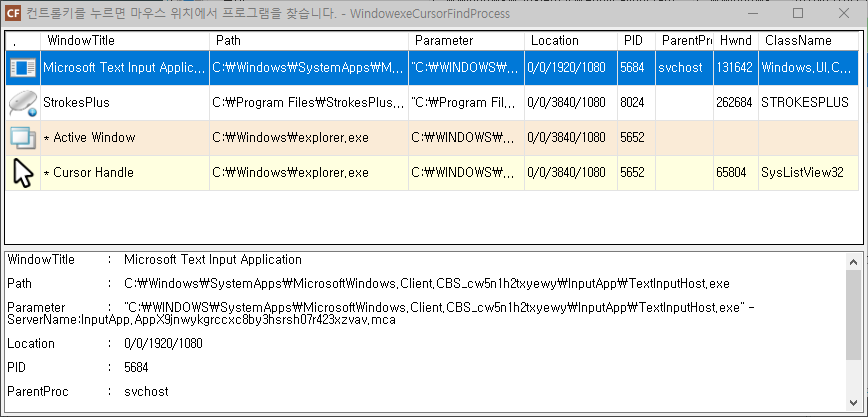 제일 아래에 있는 커서 모양은 마우스 포인터 위치에 있는 핸들 프로세스 및 클래스 정보입니다.