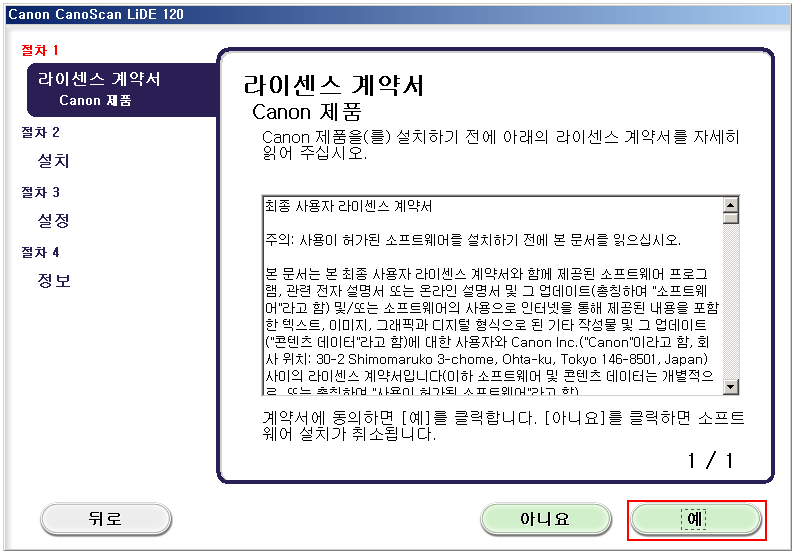 라이센스 계약서 동의에 예를 클릭합니다.