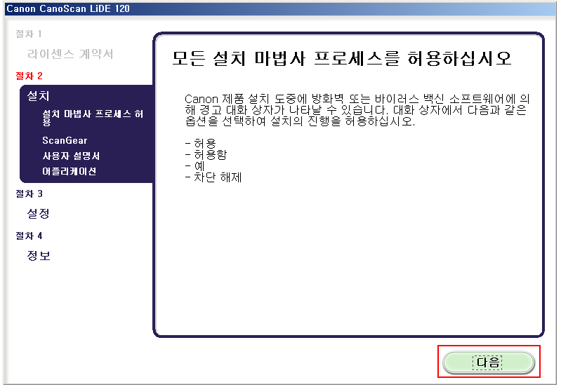 이후 부터는 다음 또는 동의, 계속을 클릭하면 됩니다.