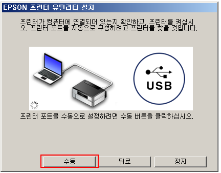 프린터를 자동으로 인식합니다. 자동으로 인식하지 않는 경우 수동을 클릭해서 다시 설정하세요.