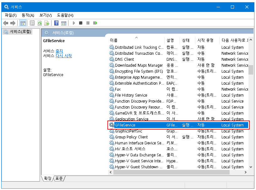 서비스에 등록된 항목입니다. 서비스의 이름은 GFileService 로 표시되어 있습니다.
