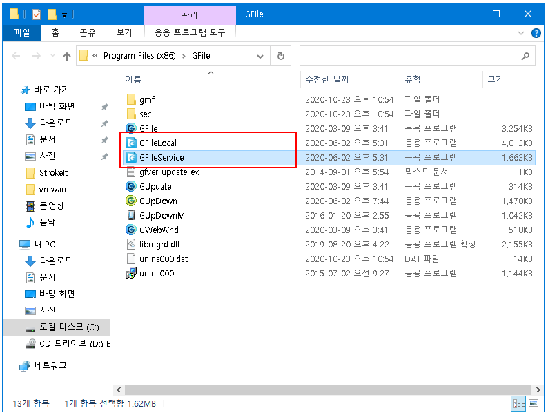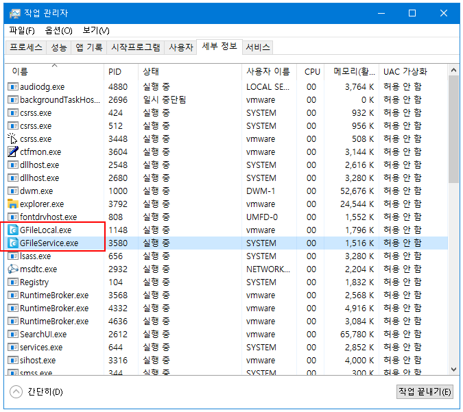 작업관리자의 실행중인 프로세스를 열어보면 GFileLocal.exe 및 GFileService.exe 프로세스가 실행중인 경우가 있습니다.