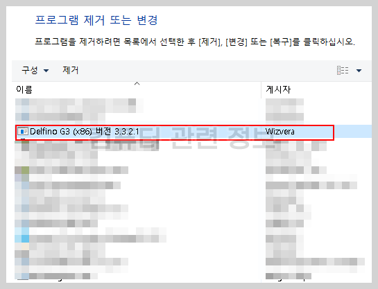 이 프로그램을 삭제해보겠습니다. 제어판 프로그램 추가/제거에서 [Delfino G3 (x86) 버전 3.3.2.1] 를 더블클릭해서 삭제하면 됩니다. 뒤의 숫자는 다를 수도 있습니다.