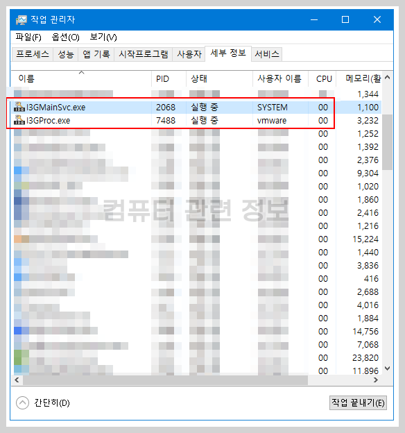 작업관리자를 열어서 확인해보면 두개의 프로세스가 실행중입니다. I3GMainSvc.exe I3GProc.exe