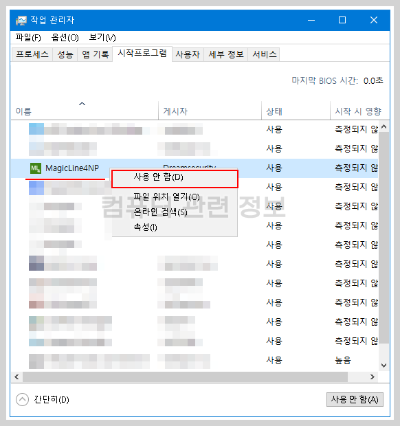 목록에서 MagicLine4NP 를 마우스 우클릭하고 사용안함을 클릭하세요.
