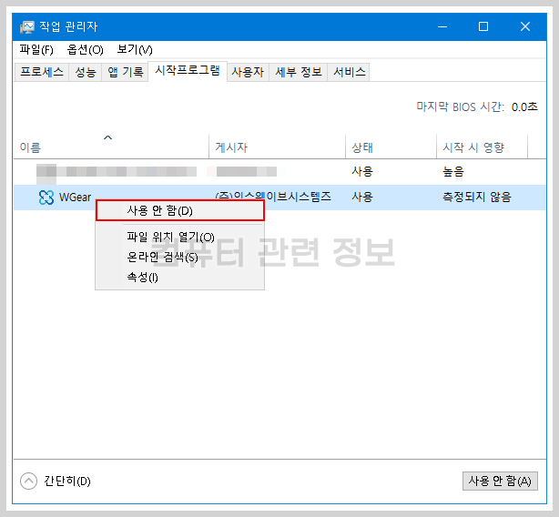 이 프로그램을 사용안함으로 설정하려면 작업관리자를 실행하고 시작 프로그램 탭으로 이동하세요.