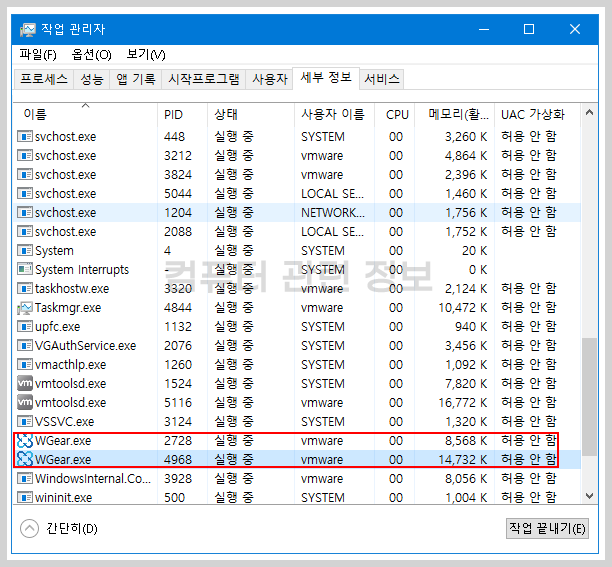 작업관리자를 실행해보니 WGear.exe 프로세스가 실행중이네요.