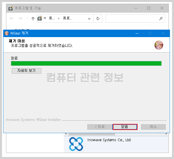 제거 완료 메세지가 나오는데요. 닫음을 클릭하면 됩니다.