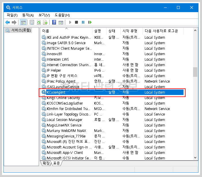 서비스 목록이 많이 보이는데요. KCaseAgent 를 찾아서 더블클릭하세요.
