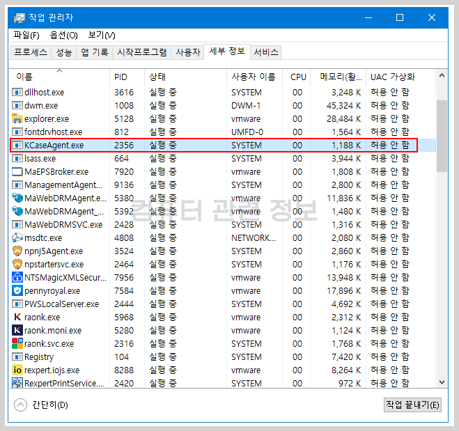 KCaseAgent.exe 작업관리자 프로세스 실행화면입니다.