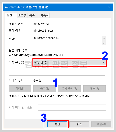 nProtect Starter 속성에서 1. 중지를 클릭하고, 2. 사용안함으로 변경하고, 3. 확인을 클릭합니다.