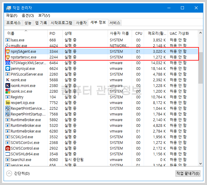 작업관리자를 실행해서 어떤 프로세스가 실행되는지 확인해보죠. nPStarterSVC.exe npnj5Agent.exe 가 실행되고 있네요.