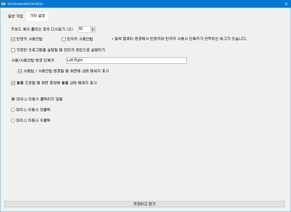 왜 그런지 모르겠는데 한영키 조합으로 사용하는 경우 가끔 이상하게 동작하는 현상이 있고, 한자키는 키업 이벤트가 발생하지 않아서 키가 계속 눌러진 상태로 인식하더군요. 그래서 두개의 키는 사용안함으로 설정해두었습니다.