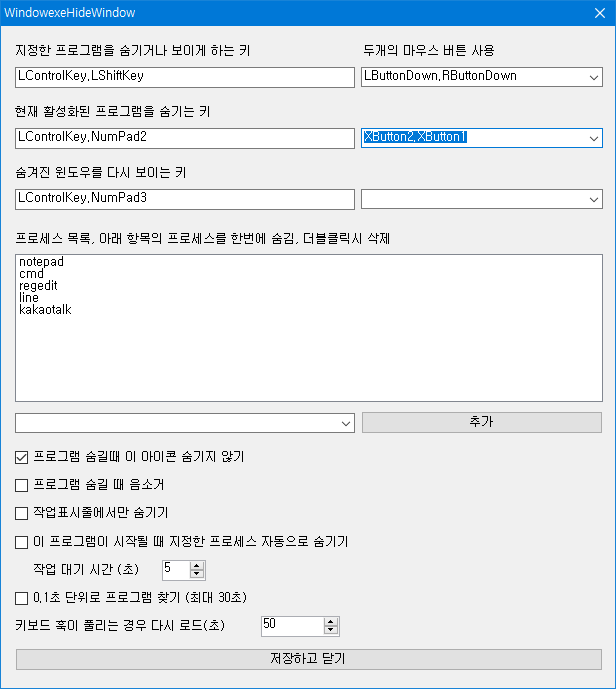 마우스 버튼 두개를 사용해서 프로그램을 숨길수도 있습니다. 두개의 버튼을 사용하는 경우 지정한 버튼을 순서대로 눌러야만 동작합니다.