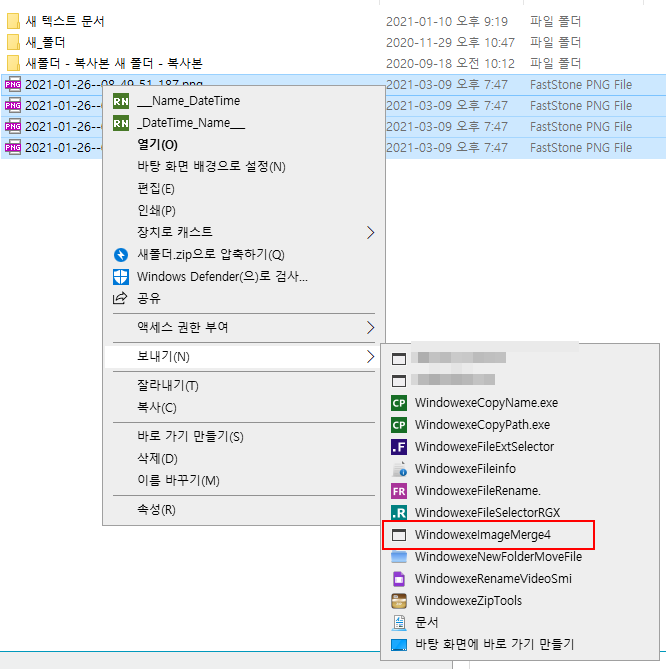 탐색기에서 원하는 이미지 파일을 네개 선택하고 우클릭, 보내기 메뉴로 가서 WindowexeImageMerge4 를 클릭하면 바로 현재 폴더에 이미지 파일이 합쳐집니다.