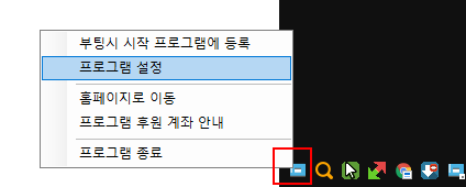 작업표시줄 오른쪽 시스템 트레이에 네모난 아이콘이 생기는데 마우스 우클릭해서 설정을 누르세요.