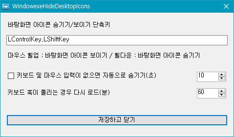 바탕화면에 있는 아이콘들을 자동으로 숨기거나 마우스 휠업/휠다운을 사용하거나 지정한 단축키를 사용해서 아이콘을 간단하게 숨기기/보이기를 할 수 있는 자작 프로그램입니다.