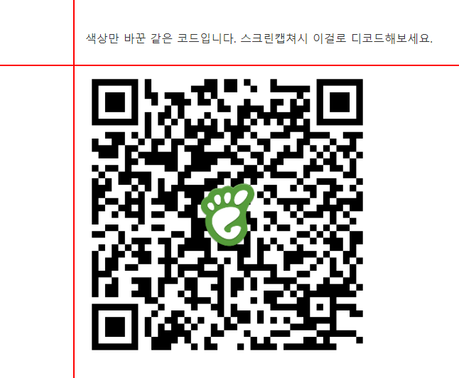 적용한 큐알코드 이미지 입니다. 스크린샷 캡쳐로 아래의 이미지를 디코드를 하는 경우 배경색이 흰색이 아니라서 그런지 인식률이 떨어지네요.