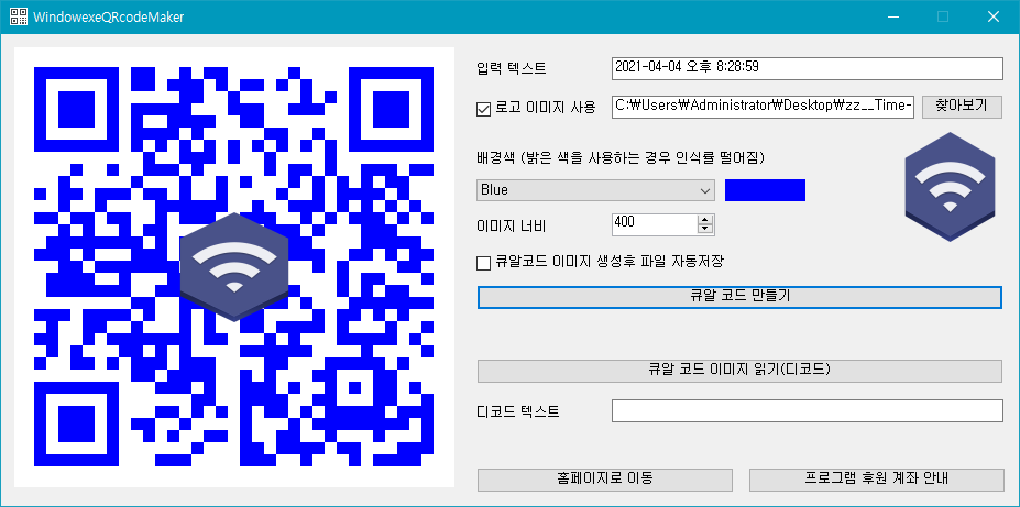 로고 이미지를 사용한 큐알코드 이미지입니다. 아래 스크린샷 부터는 초기버전입니다. 위 스크린샷이 최신버전의 프로그램입니다.