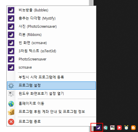이 프로그램은 단축키를 사용하여 화면보호기를 즉시 실행하는 프로그램입니다. 메뉴에서도 바로 실행 가능.