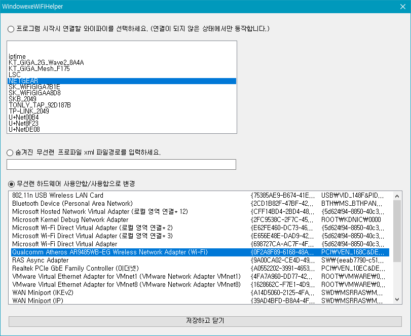 3. 무선랜 연결이 끊기는 경우 무선랜카드 하드웨어를 끄거나 킬수 있습니다. 사용할 장치를 선택하고 저장하고 닫기를 누르면 바로 적용이 됩니다.