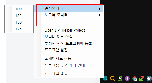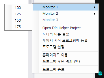 모니터의 DPI 설정을 자주 변경하는 경우 디스플레이 설정에 들어가서 매번 작업을 하는게 귀찮을 수 있는데요. 이 프로그램은 시스템 트레이에서 아주 간단히 설정을 변경할 수 있습니다.