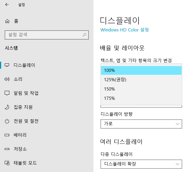 아래 스크린샷은 100% , 125% , 150% , 175% 이렇게 지원되는 노트북입니다.