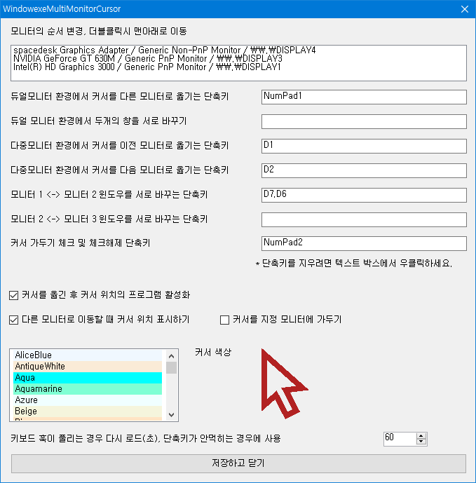 저장하고 닫기를 누르면 바로 적용이 됩니다. 지정한 단축키를 누르면 다른 모니터 정중앙에 마우스커서가 이동합니다.