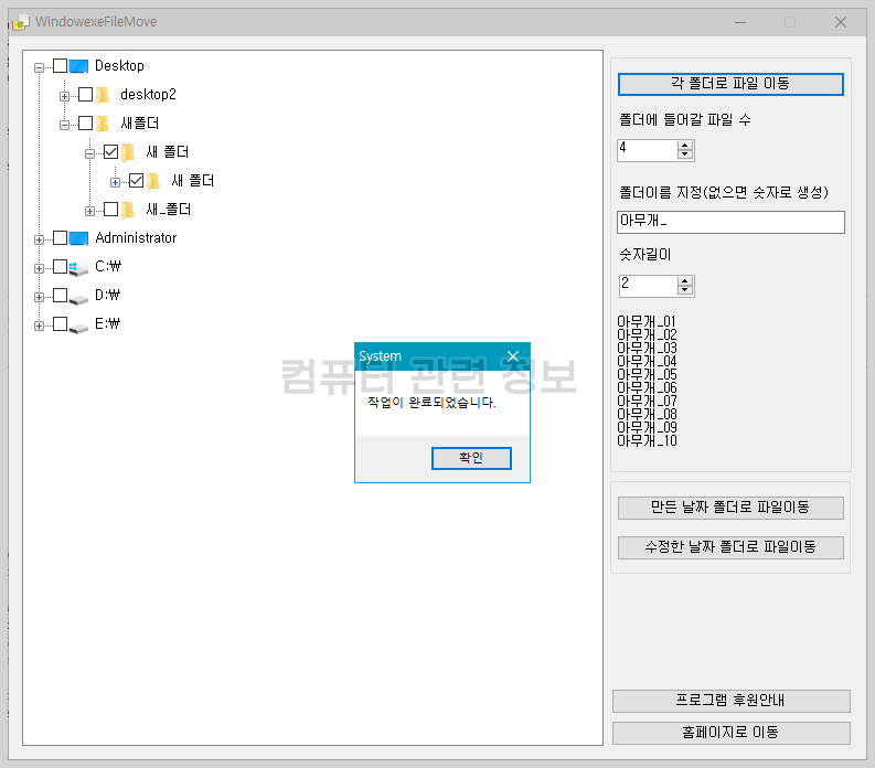 각 폴더로 파일 이동 버튼을 클릭하세요. 작업이 끝나면 완료 메세지가 나옵니다.