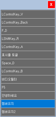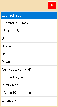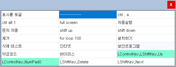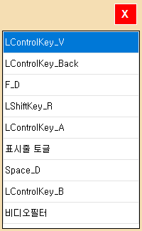 아래 스크린샷의 단축키 목록에서 마우스로 해당 셀을 클릭을 하면 단축키가 눌러집니다. 상단을 잡고 드래그하면 원하는 위치로 이동이 가능합니다. (닫기 버튼은 프로그램 종료가 아니고 윈도우 숨기기)