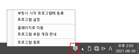 작업표시줄 오른쪽 시스템 트레이에 모니터 모양의 아이콘이 생기는데 마우스 우클릭해서 프로그램 설정을 클릭하세요.