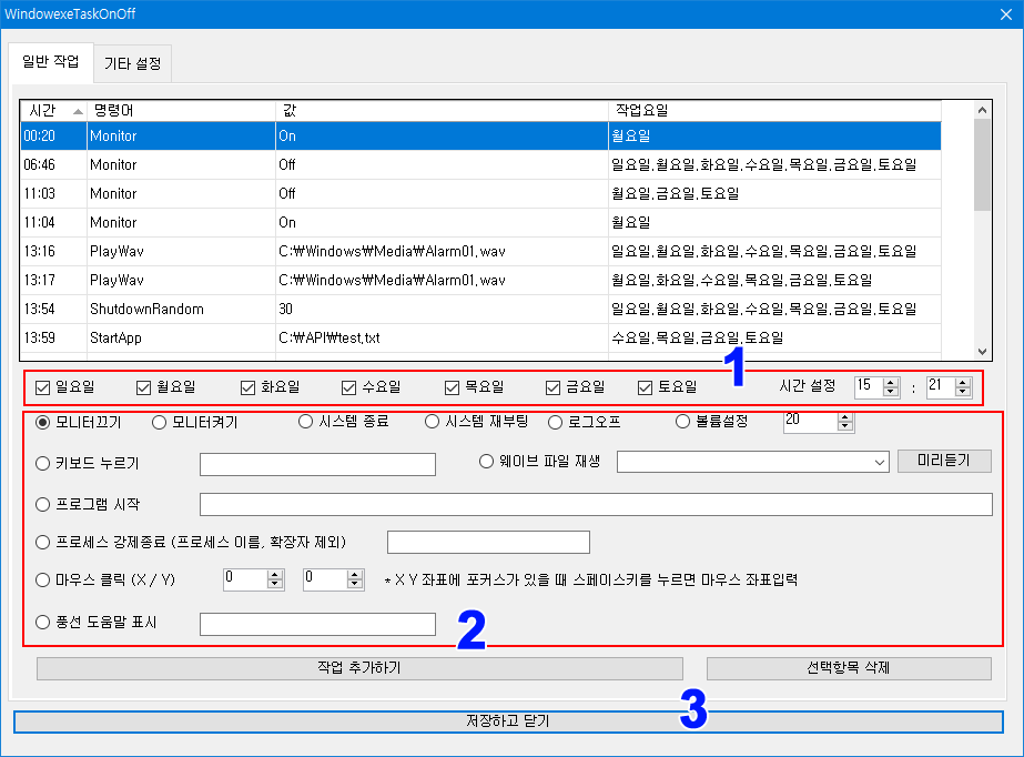 사용자가 지정한 시간에 모니터를 끄거나 켤수도 있고, 시스템 종료, 재부팅, 로그오프, 볼륨설정, 키보드 누르기, 프로그램 시작 및 강제종료, 웨이브파일 재생, 마우스 클릭, 알림 메세지를 표시할 수 있는 자작 프로그램입니다.