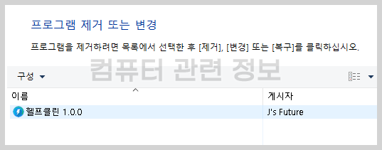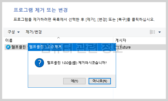 헬프클린을 컴퓨터에서 제거하려면 제어판 - 프로그램 추가 제거에서 헬프클릭 1.0.0 을 더블클릭하면 삭제가 진행됩니다.