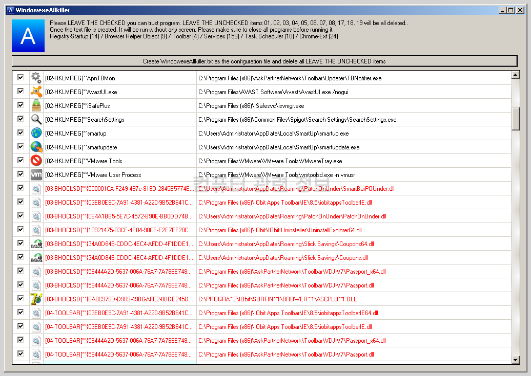 개쓰레기 프로그램들을 삭제하는 아주 강력한 프로그램이지만 개쓰레기들을 목록에서 분류하는 건 사용자의 몫입니다.