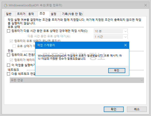 작업스케쥴러에서 오류가 발생했습니다. 오류 메시지 : 하나 이상의 지정된 인수가 잘못되었습니다.