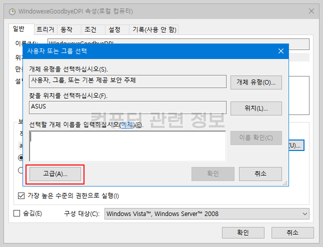 사용자 계정이름이 asus 에서 ASUS\asus 로 변경되었습니다. 확인을 누르면 됩니다.