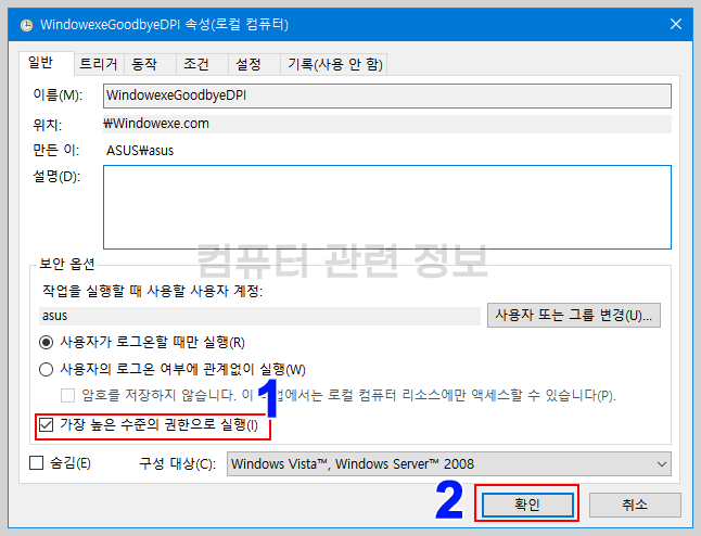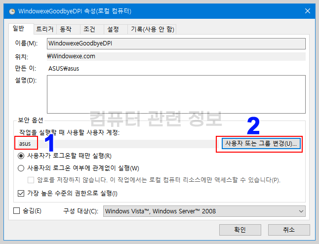 이 문제는 등록된 스케쥴러의 사용자 계정 문제인데요. 보안옵션에서 사용자를 찾아서 변경하면 됩니다.