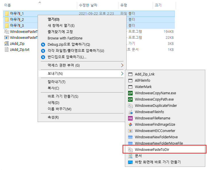 탐색기에서 붙여넣기를 하고 싶은 폴더를 선택을 하고 마우스 우클릭 - 보내기 - WindowexePasteToDir 를 클릭하면 프로그램이 실행되면서 복사한 폴더나 파일이 각각의 폴더에 붙여넣기가 됩니다.