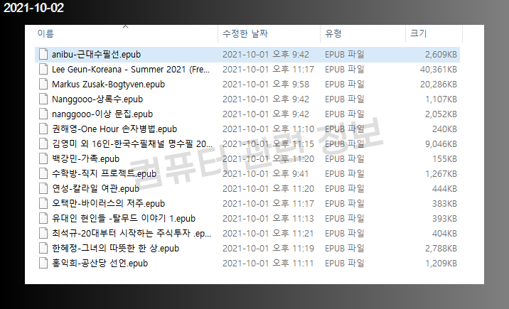 전자책 이북파일의 확장자는 Epub 인데요. 이북파일의 이름은 대부분 규칙적이지 않고 다운로드 받는 사이트에서 그냥 임의의 파일이름이 정해지곤 합니다.